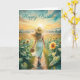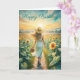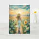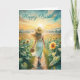 A woman walking through a field of sunflowers. Suitable for a birthday for anyone. You can change the text