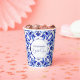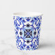 Talavera azulejo blue tiles vintage Mexican bridal shower monogram printed paper cups template, Mediterranean blue tile pattern Maiolica blue tiles Greek tiles pattern bridal shower paper cups personalised bridal shower tableware table decor
