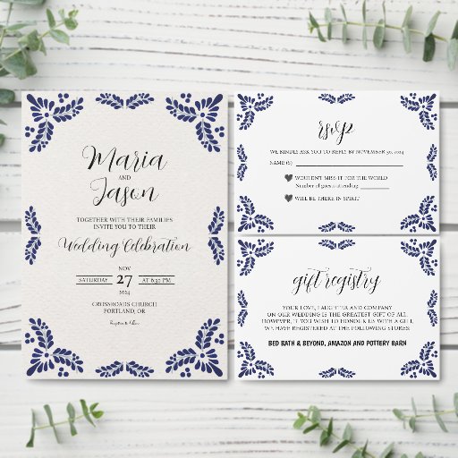 This Talavera Black Floral Minimalist Spanish Wedding Invitation design features a minimalist approach with delicate, symmetrical black floral motifs placed in each corner and along the edges. The small, leaf-like shapes create a sense of movement while maintaining an airy, open space in the center, allowing for ample text placement. The simplicity and elegance of the pattern evoke traditional Talavera tiles, giving the design a classic Mexican artisanal feel.