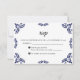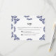 This Talavera Black Floral Minimalist Spanish Wedding RSVP Card design features a minimalist approach with delicate, symmetrical black floral motifs placed in each corner and along the edges. The small, leaf-like shapes create a sense of movement while maintaining an airy, open space in the center, allowing for ample text placement. The simplicity and elegance of the pattern evoke traditional Talavera tiles, giving the design a classic Mexican artisanal feel.
