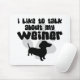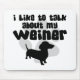 Funny Dachshund products! "I like to talk about my weiner" is a silly dog lover gift. A silhouette of the dog is in the middle, with a paw print in the back.