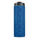 Tall blue travel mug with a black lid, featuring a pattern of lighter blue dots in varying sizes, creating a playful and modern design.