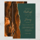The left-hand edge of this elegant modern all-in-one budget wedding invitation features a burnt orange and rust watercolor agate border trimmed with gold faux glitter. The customisable text combines gold-coloured handwriting, copperplate and italic fonts on an emerald green background. The burnt orange agate design also appears on the back of the card.