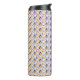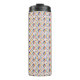 Tall travel mug with a vibrant, geometric pattern of colorful squares and rectangles on a white background, topped with a black lid.