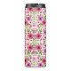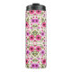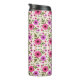 Tall tumbler with floral pattern, featuring vibrant pink and purple flowers and green leaves on a white background. Black lid tops the elegant design.
