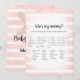 Enjoy playing this Who's My Mummy? baby shower game on soft, pink and white watercolor stripes background. Cute, tan, bunny rabbit on back with templates created for you.