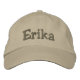 Your name embroidered on a khaki tan custom baseball hat / baseball cap. Text is fully customisable. Shown is the editable name, Erika. Designed by 369MyName.
