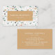 A modern business card design featuring a trendy terrazzo pattern in shades of green, tan, grey, coral and black on a white background. Personalise it with your name and title in white text on tan rectangle. Add your name, title and contact details on the reverse side.