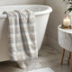 This neutral rustic plaid bath towel in shades of tan, grey, and ivory will fit well with a range of colour schemes.