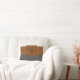 This trendy, minimal geometric design features a strip of faux light saddle brown tan leather in the middle third, a colour block of solid white faux linen on the top third, and a colour block of charcoal grey faux linen on the bottom third. At the centre is a rustic, stitched tan leather rectangle with a darker brown monogram at the centre. A faux seam on each side of the leather strip joins the three pieces, making a stylish farmhouse-style addition to your home.