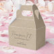 Hangover kit wedding favour box, whimsical minimalistic modern, customisable white script typography. The tan colour printed linen texture background adds a touch of an organic feel and classic elegance. Other colours are available.
