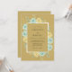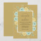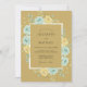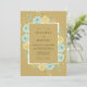 This design features a warm ochre backdrop adorned with soft watercolor roses in shades of aqua blue and pale yellow. Delicate green leaves and sprigs of foliage surround the central area, creating a romantic and vintage-inspired aesthetic. The colour palette offers a unique blend of earthy tones and cool floral accents, perfect for a spring or summer event.