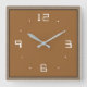 A plain square kitchen clock in light tan with modern white numerals. Features include a small black patterned border and Grey or black hands .