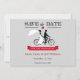 Trendy Save the Date cards with a bride and groom on a tandem bicycle. Fun vintage design with a red banner on a grey background. Also available in other colours. Get the matching save the date stamps below: