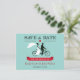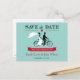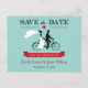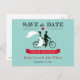 Tandem bicycle wedding save the date postcards with a silhouette of a bride and groom riding a tandem bicycle. Black and white design with a red banner and heart on an aqua background. Personalised with your information in the space provided. Get the matching Tandem Bicycle Save the Date stamps below: