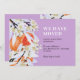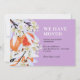 Elegant and chic new home moving announcement card with beautiful blooming tangerine branches and text "We have moved". Floral botanical card with spring delicate flowers and citrus. Orange, pastel and lilac colours. Add your names and address.