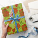This upscale fine quality wrapping paper features an original digital painting by Leslie Sigal Javorek that emulates the look of an iridescent Lime Green silk fabric topped with what appear to be hand-painted peonies in Tango Red.