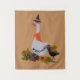 Goose with "Welcome" across lower body, is dressed in Conical hat with orange ribbon and scarf around neck. Black crow is walking behind. Both are strolling across sunflowers and acorns in the path.
