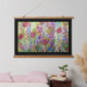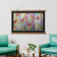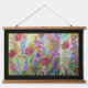 Colorful floral tapestry with pink wildflowers with blue stems created as mixed media art with watercolor and acrylic, along with paint pens, daubers, and washi-tape.