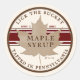 An antique white background with brown text in an old-style font. Maroon band behind sugar maple leaf gives this label a vintage look.