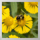 A bumblebee is perched on a yellow flower, gathering nectar and pollen. The flowers are vibrant, with detailed petals and green leaves.
