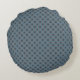 Round throw pillow with a pattern of little targets in light grey and blue on a dark grey background.