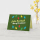 Tarjeta de felicitación de feliz navidad. Está en inglés y español con luces navideñas.