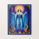 Puzzle in the tarot card "The Queen of Wands". Standing regally in flowing blue robes, radiant under a golden halo, she holds a wand, symbolising power and creativity. Surrounded by fiery branches and stars, she exudes confidence, warmth, and spiritual strength