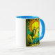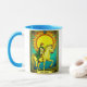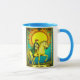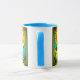 Mug in the tarot card, “The Sun,” depicting a radiant sun dominating the sky, its golden rays surrounding a boy riding a white horse. He symbolises innocence and vitality, while the vivid blue background radiates joy and clarity.