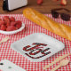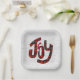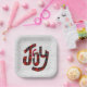 Santa Claus hat on red and black tartan plaid JOY in fun font style on white birch tree background.