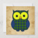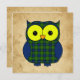 Cute cartoon owl with a Muir tartan plaid pattern on a background of crumpled paper. Perfect for a child's birthday. Customise it with your own text.