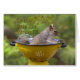 Cute, funny image of Squirrel in an old yellow colander with comment from the Squirrel “Does WHAT taste like Chicken?!?”