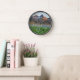 I received this as a birthday gift from my husband to replace a clock that had broken. It was perfect, pictures of my sweet family to see at every hour of the day. The size of the pictures looks nice for the size of the clock and I love looking at it! The only downside is there is no cover for the battery on the back, which makes me nervous having little kids running around the house, but an easy fix with some tape. The printing turned out clear, considering they were all cell phone pictures. Some of them look slightly grainy upon getting close up. But so nice overall!
