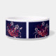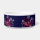 This design is a tattoo of many different flowers, leaves, and vines. A few butterflies can be seen flying around the flowers. The colours of the tattoo are a red colour with a hint of peach. There are 4 designs on the dish going around the sides of the dish. This dog dish can be customised with your pets name on the front of the dish.