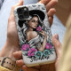 Elevate your phone's style with this hand-drawn, tattoo-inspired illustration featuring a stunning woman with long, wavy silver hair wearing a sleek black hat and off-the-shoulder white top. Surrounded by vibrant neon pink and teal flowers, the surreal beauty of the scene is enhanced by intricate mandala patterns in the background. Customise it with your name for a personal and artistic touch, perfect for anyone looking to merge style with grace and a touch of zen.