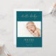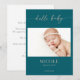 Welcome your precious miracle in timeless style with this taupe minimal hello baby photo announcement card. The design features an elegant calligraphy script in taupe, which reads "hello baby", a teal and white background to highlight your baby's first portrait, names, birthdate, etc. Add a personalized message on the back to share with friends, family and loved ones.