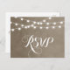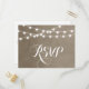 Chic modern summer wedding RSVP reply postcard design with simple elegant glowing string lights hanging across the top and a classy mix of modern and calligraphy script fonts on a printed faux watercolor texture background. A simple and stylish preppy design, perfect for summer! Click the CUSTOMIZE IT button to customise fonts, move text around and create your own unique one-of-a-kind invitation design.