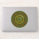 This mandala was designed for the zodiac sign, Taurus, depicting an emerald stone in the centre surrounded by elements representing the sign, such as the symbol for the sign, the constellation, and the alchemical symbol for Earth, as well as filigree vines and weaves wrapping it all into a solid image in shades of browns, greens, and golds.