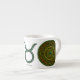 This Taurus themed mandala features an emerald stone surrounded by the symbol for the sign, the constellation, and the alchemical symbol for Earth among filigree and weaves. This mug is available in jumbo, espresso, and bone china sizes and styles.