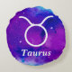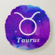 Taurus symbol in white with a purple and blue space nebula and the word "Taurus". Decorate your celestial bedroom or dorm room with this taurus zodiac pillow.