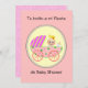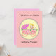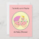 invitacion para baby shower en español con temas de dibujo de bebe en carriola con fondo en circulo amarillo enmarcado en rosa / baby shower invitation for Spanish-themed drawing baby in stroller-bottom yellow circle framed in pink