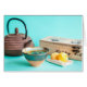 Tea set for one person with cast iron teapot, handmade clay teacup, tea box and two cheese scones.