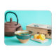 Tea set for one person with cast iron teapot, handmade clay teacup, tea box and two cheese scones.