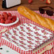 This Pattern features a pink tea cup with a teabag, matching teapot and a cupcake.