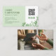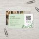 Tea green business card with green as the accent colour and a calm look for any profession with your social media information in the form of your personal QR code and, on the back, a photo. Greenery business card with calm sprigs of greenery in sage green, cute social media icons, and your QR code.