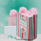 This flat sheet wrapping paper has a colourful tea party birthday theme and is ready for you to personalise with your own text. The set of three paper sheets is colour coordinated in stripes, polka dots and teapot patterns.