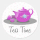 Fun tea party envelope seal done with a white and pink polka dot background. Cartoon vector graphics of a pink tea pot and cups decorate the sticker and text under reads, Tea Time. Personalise the text to read anything you wish. Fun way to finish off your tea party invitations, or as labels for your home made teas.