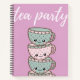 Cute pink girly trendy notebook with "Tea party" message and illustrated teacups.