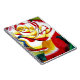 with original art design from watercolour painting by Sacha Grossel of red and yellow hybrid tea rose flower against green background. This bright and contemporary art design is of a large, close focus macro floral design of a botanical motif in bright, vivid, colourful style for floral and rose lovers everywhere.