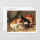 A fine art postcard featuring the painting, Tea Time (1905) Henriëtte Ronner-Knip (1821-1909), a Dutch-Belgian painter from the Romanticism movement, renowned for her depictions of dogs and cats. The artwork portrays an adorable scene of kittens sipping from a teacup with a red porcelain teapot in the background.
